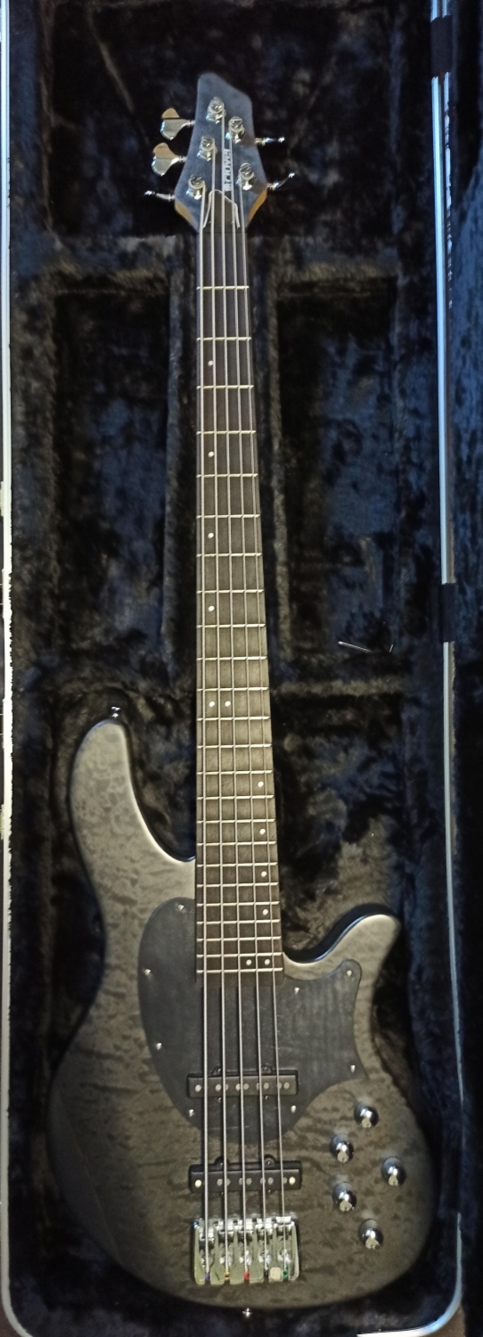 Finish: Trans Wine black SatinTop: Figured MapleBody: AlderPickguard: YesNeck Hard MapleHeadstock Top: Figured MapleFingerboard: EbonyNut: GraphtechHardware: ChromeMechanic Heads: Gotoh GB707Bridge: Custom Clover bridgeStrap Locks: Schaller 446String Retainer: NoKnobs: Dome KnobsPickups: Nordstrand NJ5n, NJ5bElectronics: Active + PassiveControls: 1x vol (pp), balance, treble, middle, bassFrets: 24 medium jumboScale: 34“Fingerboard Radius: R 500 mm (20 inch)String Spacing: br. 17Mm / nut 7,3mmNeck Width: 67mm (24st) / nut 45mmTruss Rod: Double actionNeck Thickness 1st: 20 mmNeck Thickness 12th: 23 mm