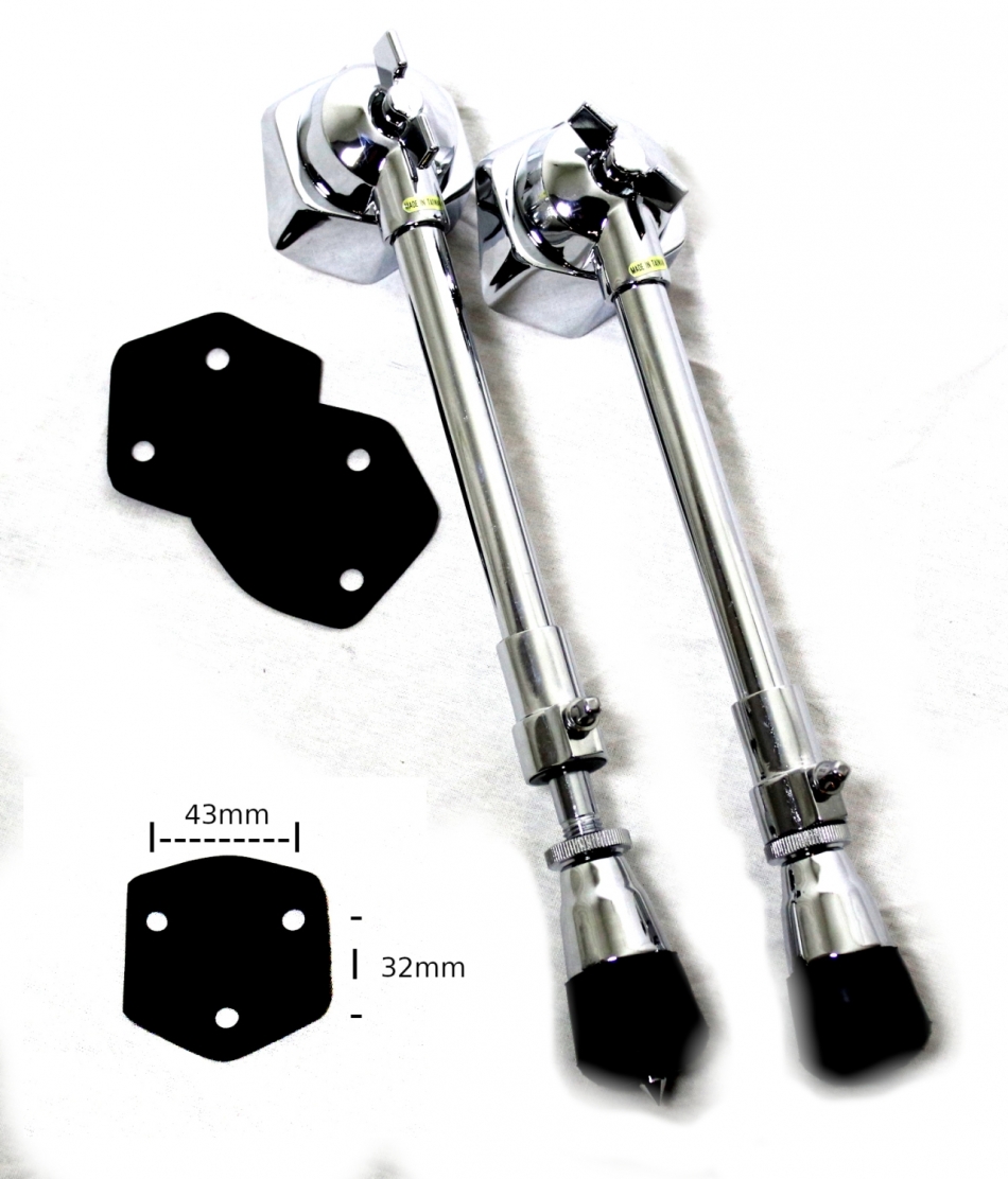 Bass drum legs - extendable from 28 - 36cm. Adjustable spikes. Mounting holes from center to center 43mm and 32mm.